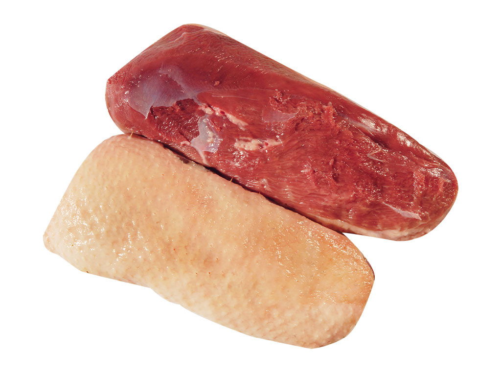 Csont nélküli, bőrös, tisztított, "A" osztályú prémium libamell filé.
