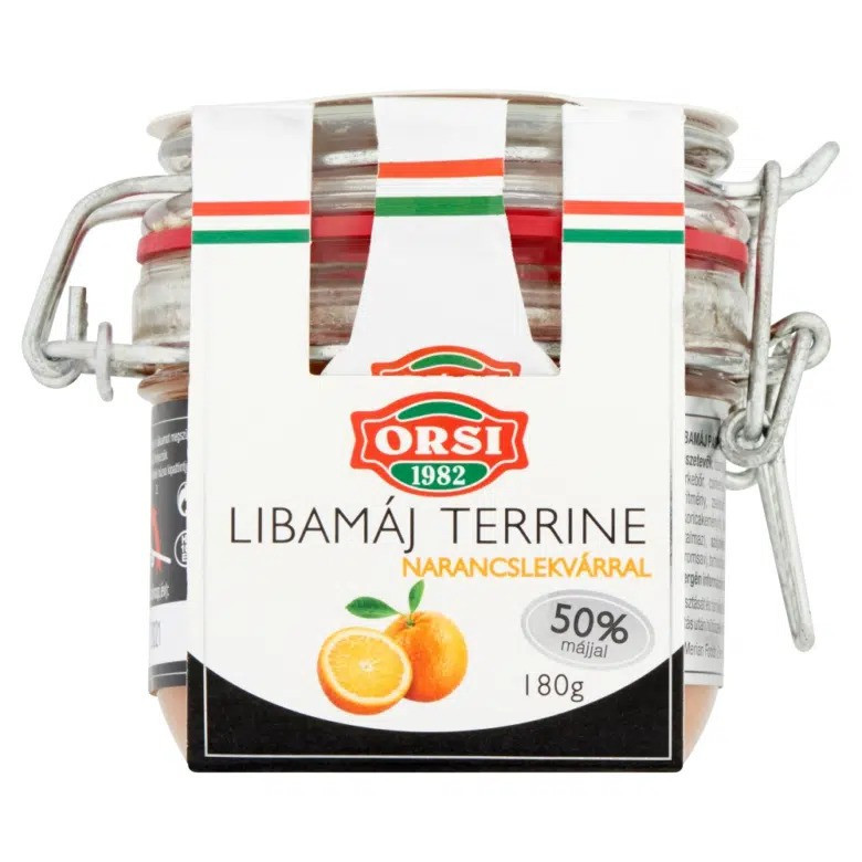 Libamáj (35%), Ivóvíz, Csirkemáj (15%), Sertésszalonna, Csirkebőr, Csirkehús, Narancslekvár (5%) {narancs 51%, szőlő sűrítmény, zselésítő anyag (pektin), citromlé}, Kukoricaliszt, Kukoricakeményítő, Tojáspor, Étkezési só, Fehérbor (szulfitokat tartalmaz), Szójafehérje, Teljes tejpor, Fűszerek, Antioxidáns (citromsav), Tartósítószer (E250)